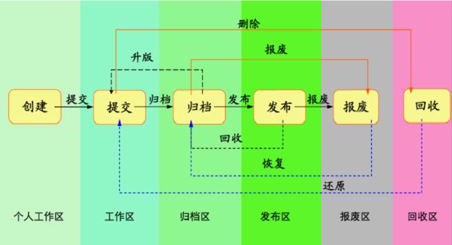 ● 设计人员在工作区进行数据检入/检出操作及协同设计,检入后图纸文档自动保存至系统,所有还在设计状态(草拟状态)的图纸自动保存在工作区。图纸文档经过审批定版后自动归档到归档区,归档区的资料为受控状态,由文控人员管理,不能随便导出、修改,更改需要权限或走更改流程。归档后的文档,通过发布操作,定向发布给指定用户,并自动在发布区出现,同时指定用户也在发布区接收公司发布的资料。废止状态的资料自动存放到废止区,不会直接删除,只供查看追溯,不能复制借用。