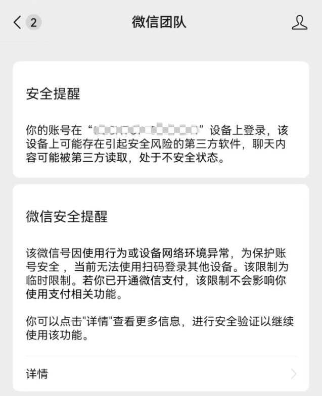 最近,我们接到好几位客户反馈同一个情况:登录电脑版微信(也就是微信PC端)时,突然弹出一个安全提示,看着挺唬人的,如下图。大家第一反应都是:“是不是我电脑中毒了?还是账号被盗了?”原因分析:微信PC端更新引发的“误伤”。经过咱们技术团队的排查分析,微信这次提示的根源是这样的:微信PC端近期做了一次分批次的灰度热更新。在这次更新中,微信强化了它的安全检测机制,特别是加强了对“进程注入”、“第三方软件挂载”以及“驱动层注入”这几类行为的检测。当微信检测到有软件在它的进程空间里有类似操作时,就会触发这个安全提示,目的是防范潜在的恶意软件。需要注意的是,这次被“误伤”的软件,远不止咱们这类企业安全软件。根据我们的观察和测试,像大家常用的搜狗输入法、讯飞输入法,以及部分协同办公助手、AI助手、系统优化工具,甚至腾讯自家的某些辅助工具,在特定情况下也会触发这个提示。